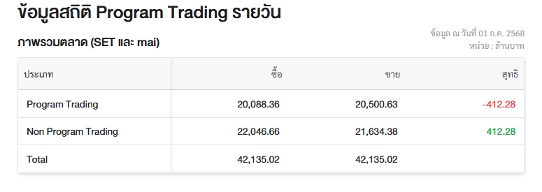 ขณะที่มูลค่าซื้อขายรายวันผ่าน Non Program Trading หรือ “การซื้อขายที่ไม่ใช่โปรแกรม” มีมูลค่าซื้อจำนวน 22,046.66 ล้านบาท และมูลค่าขายจำนวน 21,634.38 ล้านบาท เท่ากับซื้อสุทธิ 412.28 ล้านบาท