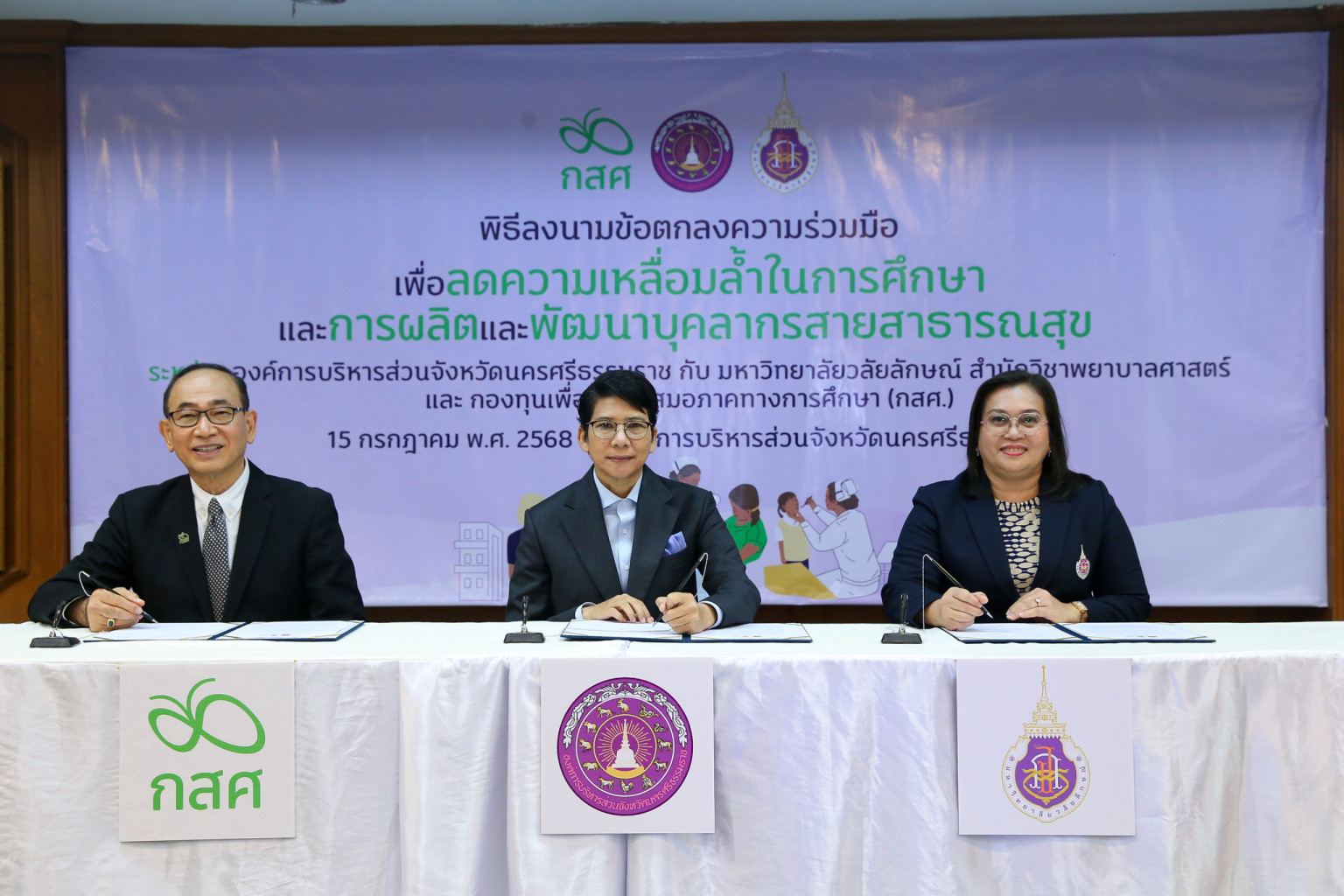 ผู้ช่วยศาสตราจารย์ ดร.อรเพ็ญ สุขะวัลลิ คณบดีสำนักวิชาพยาบาลศาสตร์ มหาวิทยาลัยวลัยลักษณ์ (มวล.) นายไกรยส ภัทราวาท ผู้จัดการกองทุนเพื่อความเสมอภาคทางการศึกษา (กสศ.) และนางสาววาริน ชิณวงศ์ นายกองค์การบริหารส่วนจังหวัดนครศรีธรรมราช (อบจ.) ลงนามในบันทึกข้อตกลงความร่วมมือ“เพื่อลดความเหลื่อมล้ำในการศึกษาและการผลิตและพัฒนาบุคลากรสายสาธารณสุข จังหวัดนครศรีธรรมราช” ร่วมกับ โดยมีผู้บริหารและเจ้าหน้าที่ของทั้ง 3 หน่วยงานร่วมเป็นสักขีพยาน ณ ห้องประชุม อบจ.นครศรีฯ เมื่อวันที่ 15 กรกฏาคม 2568 ที่ผ่านมา