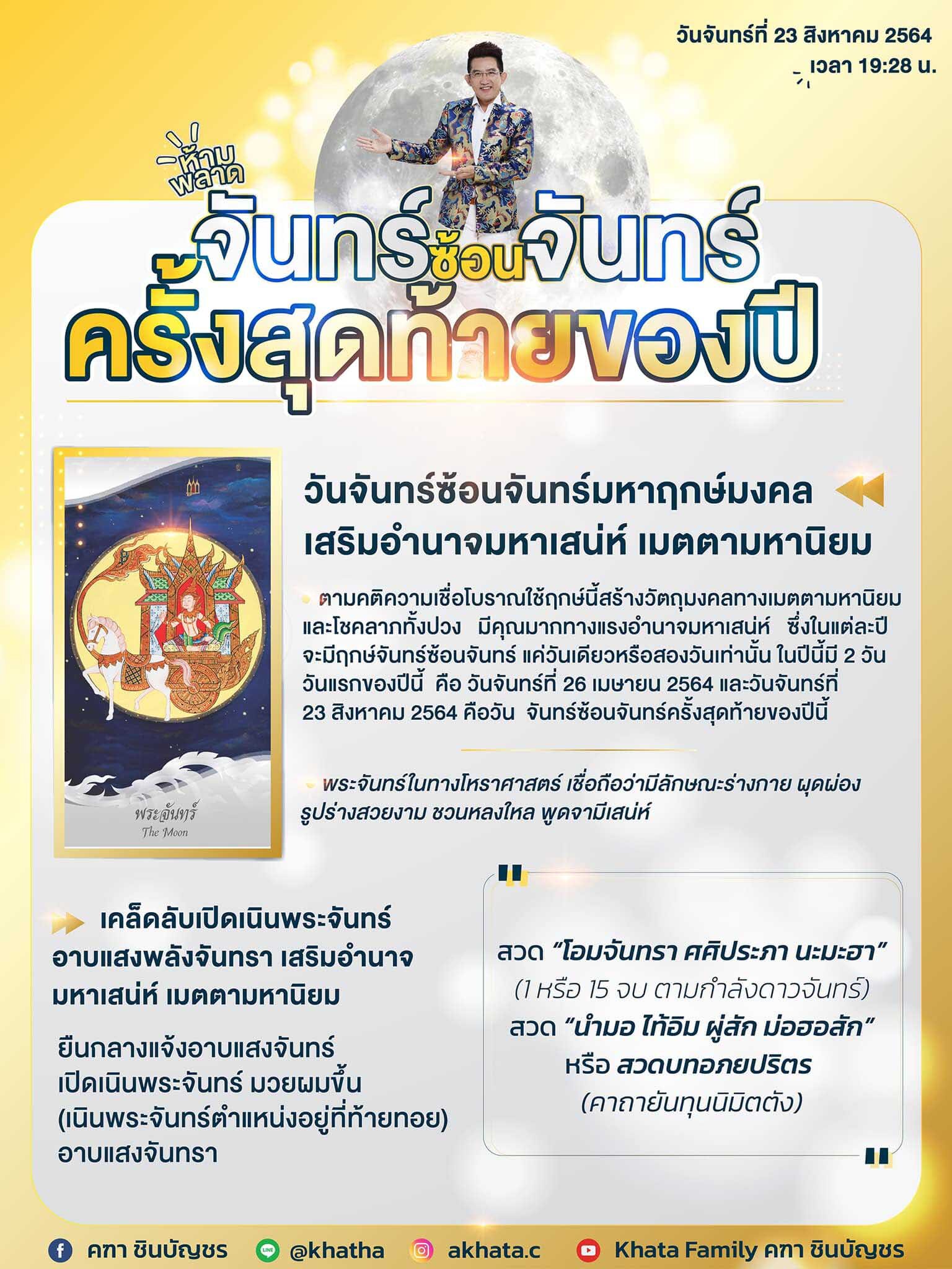 อ.คฑา ชินบัญชร เคยแนะบทสวด วิธีบูชา และอธิบายไว้ว่า "จันทร์ซ้อนจันทร์" เป็นมหาฤกษ์มงคล คติความเชื่อโบราณใช้ฤกษ์นี้สร้างวัตถุมงคลทางเมตตามหานิยมและทางโชคลาภทั้งปวง มีคุณเกี่ยวกับอำนาจมหาเสน่ห์เพราะ ดวงจันทร์ หรือ "พระจันทร์"