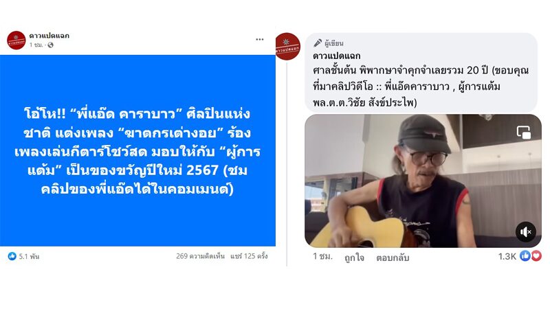 วันนี้ (1 ม.ค. 66) เรียกเสียงฮือฮาจากโลกโซเชียล เมื่อเพจ ดาวแปดแฉก ออกมาโพสต์ข้อความว่า "โอ้โห!! พี่แอ๊ด คาราบาว ศิลปินแห่งชาติ แต่งเพลง ฆาตกรเต่างอย ร้องเพลงเล่นกีตาร์โชว์สด มอบให้กับ ผู้การแต้ม เป็นของขวัญปีใหม่ 2567"