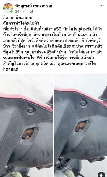 จากกรณีผู้ใช้เฟซบุ๊กชื่อ "พิชญพงษ์ เขตรการณ์" โพสต์คลิปขณะขับรถจักรยานยนต์ ซึ่งจู่ ๆ ก็มีบางอย่างโผล่มาบริเวณรูคอนโซลหน้ารถจักรยานยนต์ฝั่งคันเร่ง ซึ่งตกใจกับสิ่งที่เกิดขึ้นอย่างมาก โดยโพสต์ข้อความลักษณะตกใจ ถามชาวเน็ตว่าควรทำอย่างไรดี ต้องตั้งสติถ่ายคลิป และขับรถถึงบ้านให้เร็วที่สุด ถ้าจอดคงไม่ได้กลับบ้านแน่นอน ยอมรับว่ากลัวมาก คิดไปต่าง ๆ นานา จะเป็นงู เขียดตะปาด หรืออึ่งอ่าง กันแน่ และถ้ามันโดดออกมา รถคงจะเกิดอุบัติเหตุล้มอย่างแน่นอน พร้อมติดแฮชแท็ก #เรื่องนี้สอนให้รู้ว่าการมีสติเป็นสิ่งสำคัญในการขับรถทุกชนิดไม่ว่าคุณจะเจอเหตุการณ์ใดก็ตามแต่
