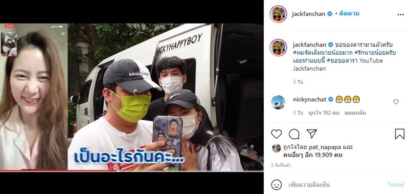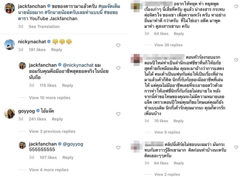 ขณะที่ แจ๊ค โพสต์ภาพวิดีโอคอลกับละอองฟองเหตุการณ์วันนั้น พร้อมบอกว่า ขอของดารามาแล้วครับ #ผมจัดเต็มนายน้อยมาก #รักนายน้อยครับเลยทำแบบนี้ #ขอขอดารา YouTube Jackfanchan ปรากฏว่าโดนชาวเน็ตรุมถล่มด่าอย่างหนัก อาทิ