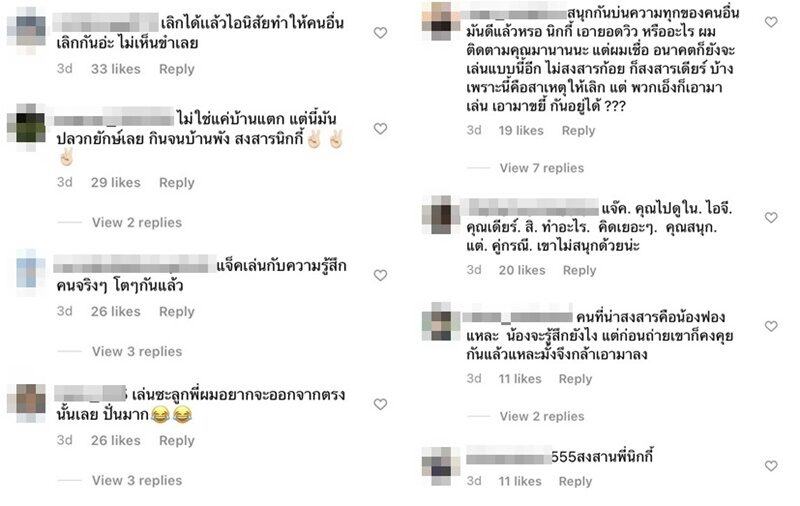 -คลิปนี้เดียร์ไม่ชอบนะผมว่า มันกระทบกับควาวรู้สึกเขามาก คิดก่อนทำบ้างนะครับคิดเยอะๆๆครับ , เลิกได้เเล้วไอนิสัยทำให้คนอื่นเลิกกันอ่ะ ไม่เห็นขำเลย , แจ็คเล่นกับความรู้สึกคนจริงๆ โตๆกันแล้ว , แจ๊ค. คุณไปดูใน. ไอจี. คุณเดียร์. สิ. ทำอะไร. คิดเยอะๆ. คุณสนุก. แต่. คู่กรณี. เขาไม่สนุกด้วยน่ะ เป็นต้น