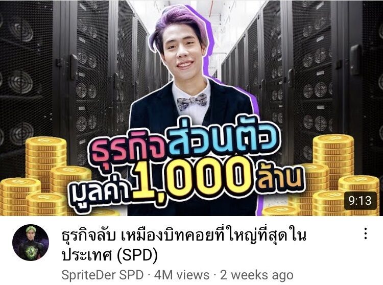 ยูทูบเบอร์แถวหน้า สไปรท์ SPD แห่งช่อง SpriteDer SPD เผยคลิป ธุรกิจลับ เหมืองบิทคอยที่ใหญ่ที่สุดในประเทศ (SPD) ธุรกิจส่วนตัว มูลค่า 1,000 ล้าน เจ้าตัวเผยว่า SPD คือใคร เอาเงินที่ไหนไปแจกไปจ่ายในการทำคลิป ผมทำยูทูบ พอดีตัวไม่ได้รวย จ่ายค่าทีมงานก็หมดแล้ว
