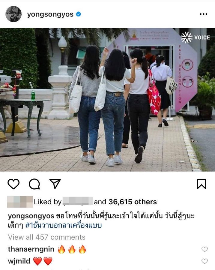 ย้ง ทรงยศ สุขมากอนันต์ ผู้กำกับภาพยนตร์และซีรีส์ชื่อดังอย่าง เลือดข้นคนจาง และ ฮอร์โมนส์ วัยว้าวุ่น ได้ออกมาโพสต์ภาพเด็กแต่งชุดไปรเวทระบุว่า "ขอโทษที่วันนั้นพี่รู้และเข้าใจได้แค่นั้น วันนี้สู้ๆนะเด็กๆ"