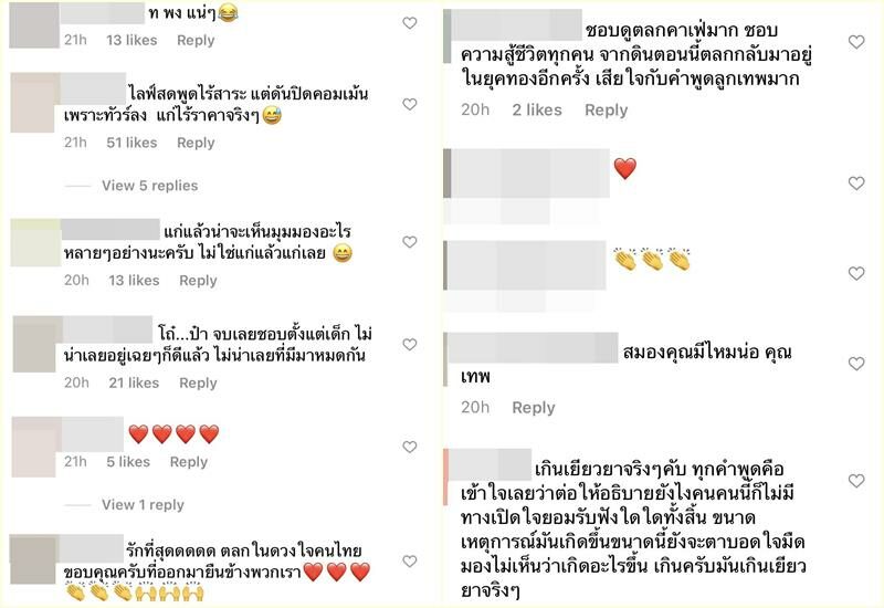 ถามถึงเรื่องที่ออกมาโพสต์ “ควรแก่อย่างมีคุณค่า ไม่ใช่แก่กะโหลกกะลา” หลายคนสงสัยว่าหมายถึงใคร? “จริงๆ แล้วเราไม่อยากออกมาพูดหรอกใครอยากรับก็รับไปก็แค่นั้นเอง ต้องบอกว่าเราออกมาแสดงความคิดเห็นเป็นกระบอกเสียงเล็กๆ ของเรานานแล้ว ก่อนที่ป๋าเทพจะออกมาพูดโน่นนี่นั่นอีก แล้วเราก็ไม่รู้ด้วยว่าป๋าเทพออกมาไลฟ์อะไร”