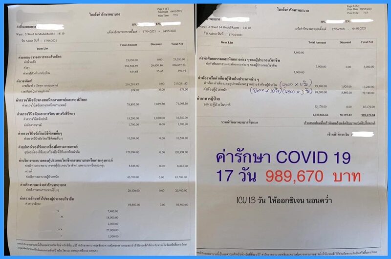 เห็นใบเสร็จแทบเป็นลม! ค่ารักษา 'โควิด' รพ.เอกชน เกือบ 1 ล้าน รักษาตัวอยู่ 17 วัน หมอแล็บบอก แทบไม่อยากฟื้นมาจ่าย ลูกเพจเผยมีประกันจ่ายให้