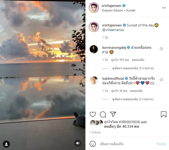 ขณะที่ คุณแม่คนสวย โพสต์ภาพลงไอจีรัวๆ ชมวิวทะเลสวยจากบ้านกับลูกชาย พร้อมโพสต์คลิปยามพระอาทิตย์ตกดินสวยมากๆด้วย ซึ่ง กรณ์ สามีก็เข้ามาคอมเมนต์หยอดสุดหวานด้วยว่า สวยเหมือนคนถ่าย