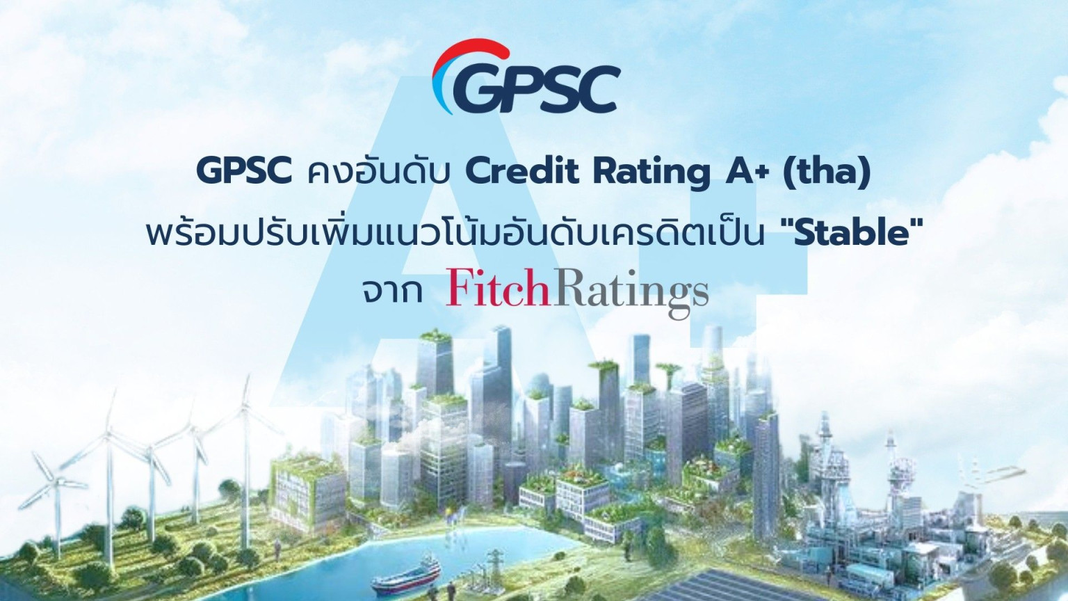 ฟิทช์ เรทติ้งส์ คงอันดับเครดิตองค์กร GPSC ที่ระดับ A+ พร้อมปรับแนวโน้มอันดับเครดิตเป็น “Stable” หรือ “คงที่” สะท้อนการบริหารจัดการทางการเงินที่แข็งแกร่งยิ่งขึ้น สร้างความเชื่อมั่นให้กับนักลงทุน ผู้ถือหุ้น และผู้มีส่วนได้เสียทุกภาคส่วน