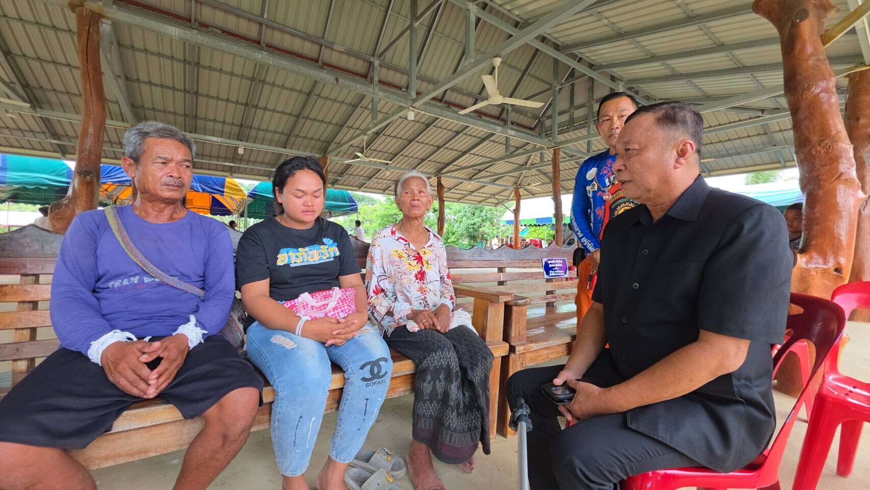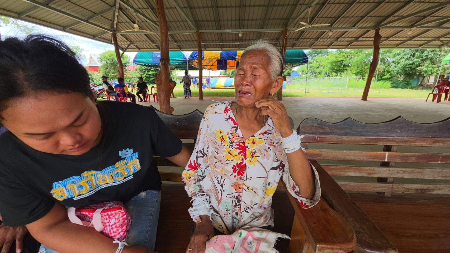 วันที่ 29 ก.ค.68 ชาวบ้านที่อพยพมาพักอยู่ที่วัดตาไก้พลวง ต.ตาไก้ อ.นางรอง จ.บุรีรัมย์ ซึ่งเปิดเป็นศูนย์พักพิงชั่วคราว ในช่วงมีการปะทะระหว่างทหารไทยกับทหารกัมพูชา ต่างเอาด้ายมาผูกแขนให้กับ นายกิมแดง กระจ่างทอง อายุ 60 ปี และนางติน กระจ่างทอง อายุ 61 ปี สองสามีภรรยาเพื่อให้กำลังใจ ที่กำลังร่ำไห้อยู่ในอาการโศกเศร้า