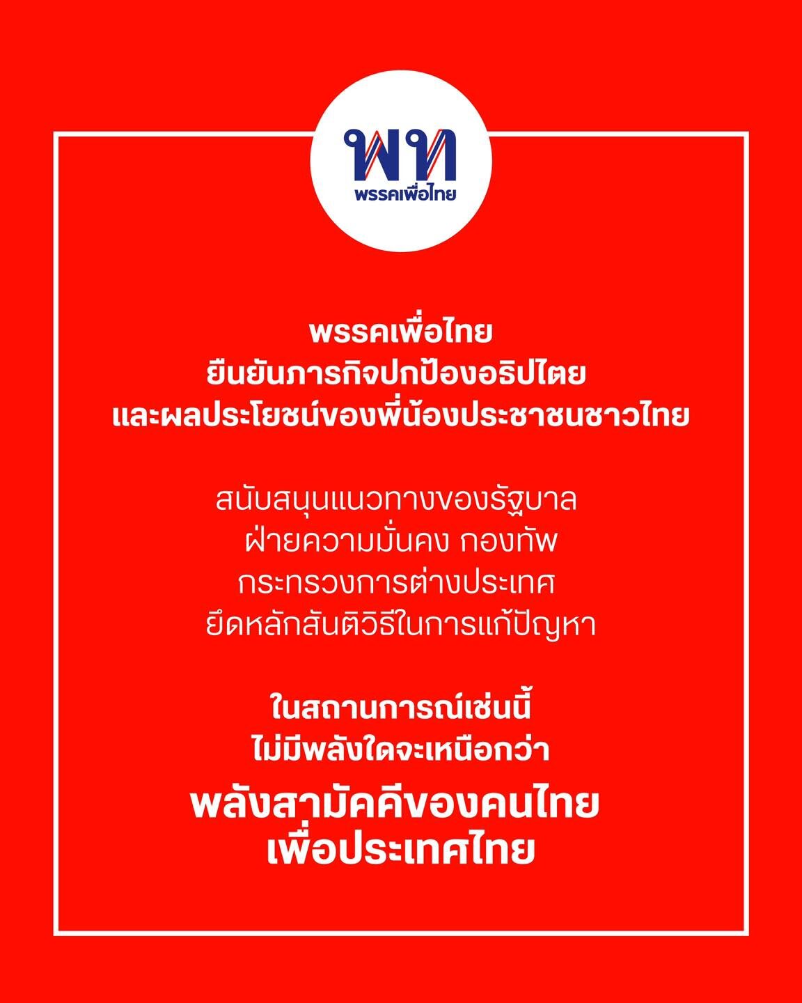 เพื่อไทย ยันปกป้องอธิปไตย หนุนรัฐบาล ฝ่ายความมั่นคง กองทัพ ยึดสันติวิธีแก้ปัญหา ลั่นไม่มีพลังใดเหนือความสามัคคีของคนไทย