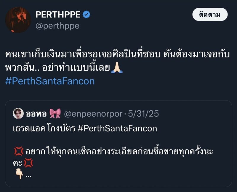 เพิร์ธ-แซนต้า ปลื้มแฟนคอน sold out โชว์ไม่อ่อมแน่นอน! - ฝากถึงมิจฉาชีพ ภูมิใจหรอทำแบบนี้ สงสารแฟนคลับกว่าจะเก็บเงินได้ มันคือความฝันที่เค้าจะได้เติมกำลังใจ