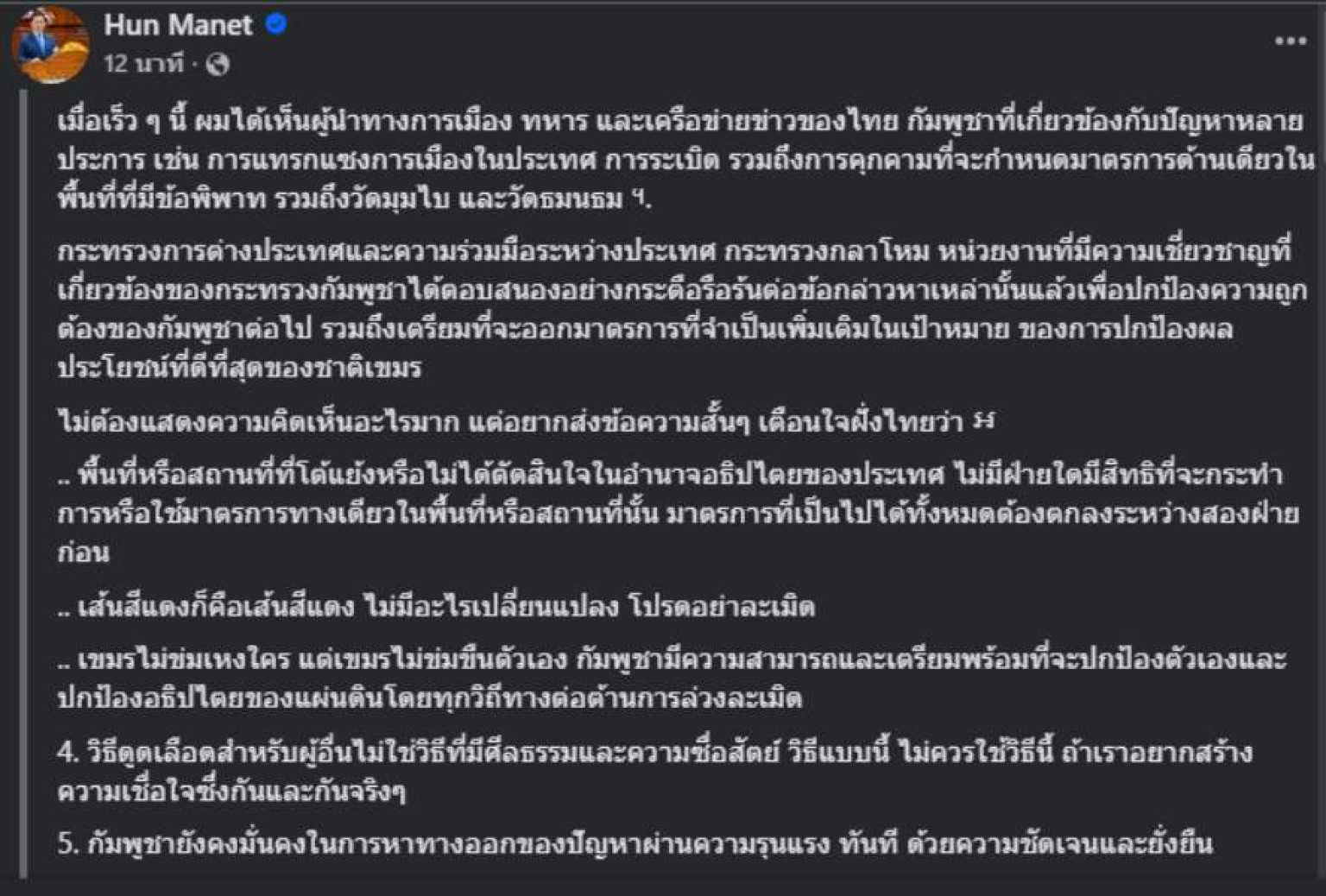 วันที่ 22 ก.ค.68 ฮุน มาเนต นายกรัฐมนตรีกัมพูชา โพสต์ข้อความผ่านเฟซบุ๊ก Hun Manet ระบุว่า…