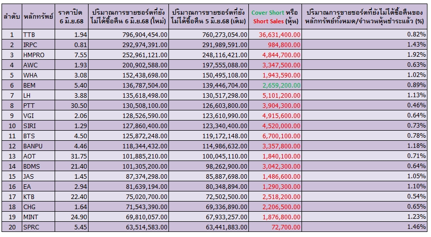 เปิด 20 อันดับหุ้นถูก “Cover-Short” สูงสุด ณ 6 มิ.ย.68