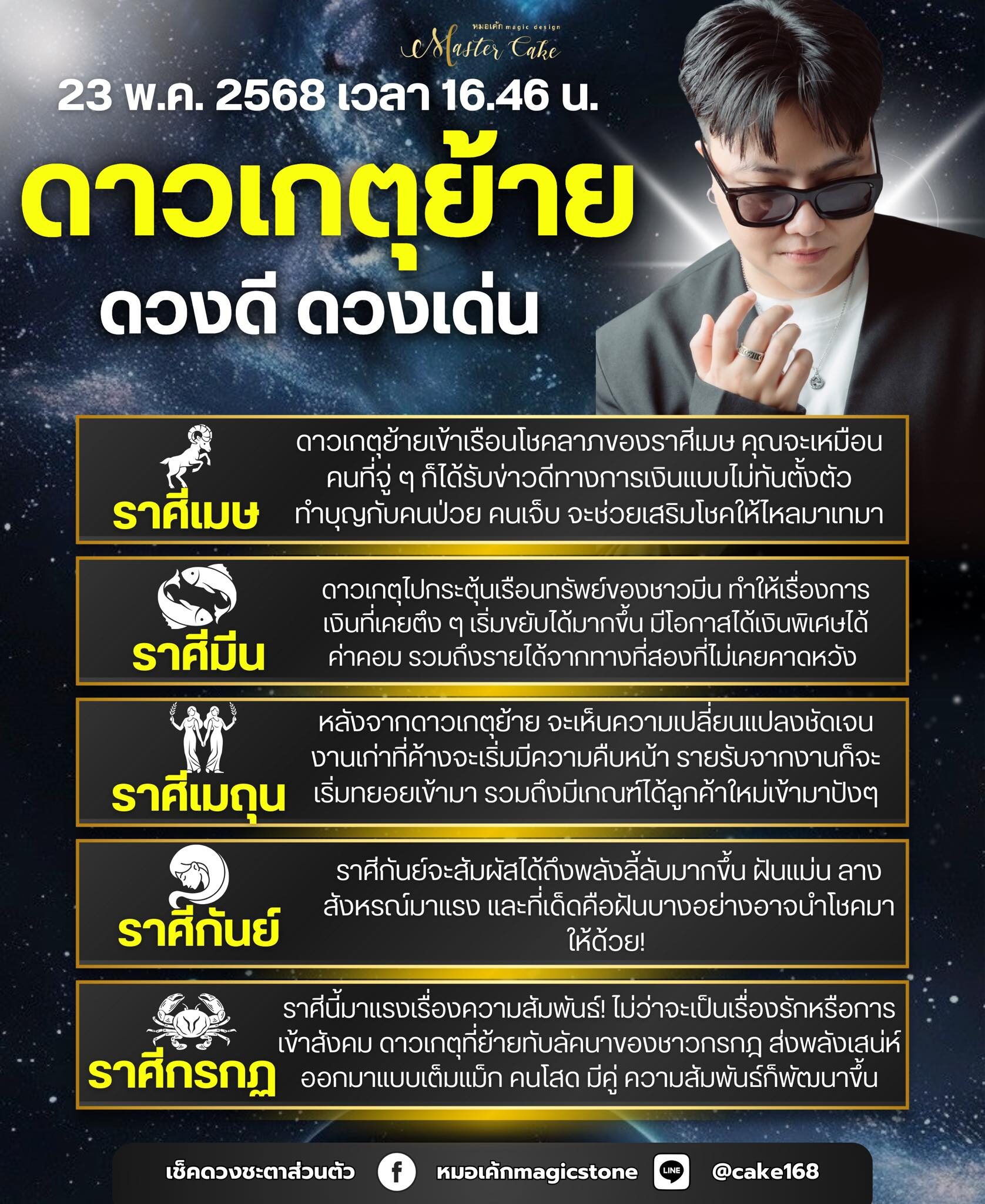 หมอเค้กMagic stone เผยถึงราศี ดาวเกตุย้าย ดวงดีดวงเด่น 23 พ.ค.68 เวลา 16.46 น. ดาวเกตุย้ายเข้าเรือนโชคลาภ คุณจะเหมือนคนที่จู่ๆ ได้รับข่าวดีทางการเงินแบบไม่ทันตั้งตัว ทำบุญกับคนป่วย คนเจ็บ จะช่วยเสริมโชคให้ไหลมาเทมา