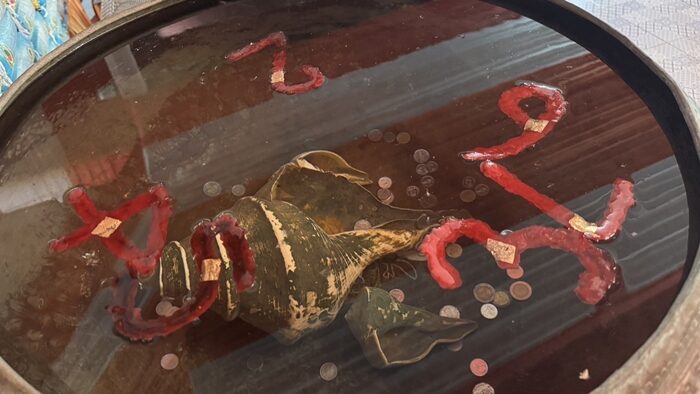 ตัวเลขที่ลอยอยู่ในอ่างน้ำมนต์ ลอยจับกลุ่มกัน มองได้หลายมุม เป็นเลข 45 เลข 2 และ เลข 376 หลายคนถ่ายภาพในหลายมุม จับคู่ตัวเลข เพื่อนำไปเสี่ยงโชค