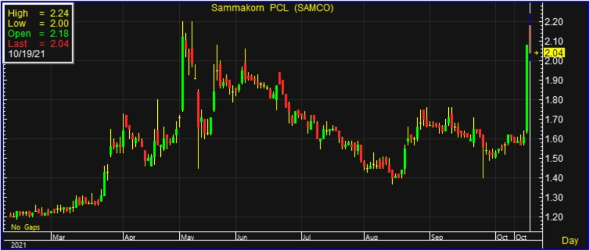 โดยราคาหุ้น SAMCO ถูกแรงขายออกมาบางส่วนในวันนี้ หลังจากที่วานนี้ราคาปรับตัวขึ้นทำจุดสูงสุดระหว่างวัน (ซิลลิ่ง) ที่ระดับ 2.08 บาท บวก 0.47 บาท หรือ 29.19%