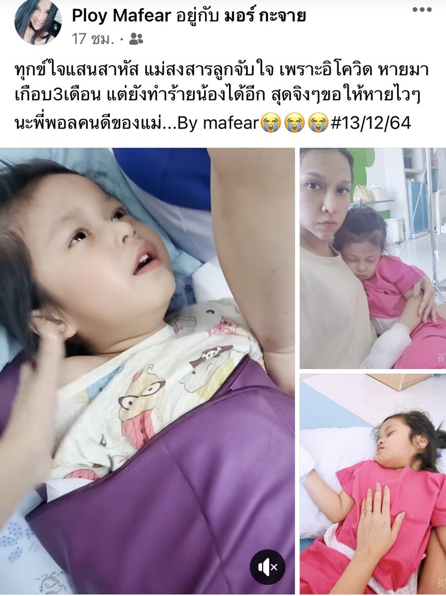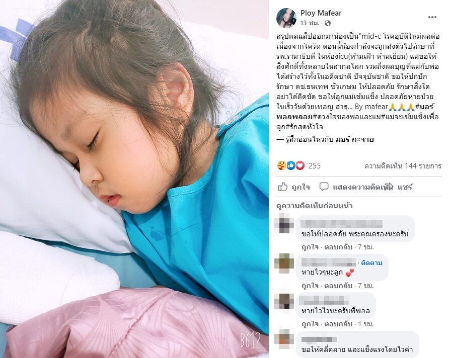 ก่อนจะโพสต์ด้วยว่าสรุปผลแล็บออกมาน้องเป็น"mid-c โรคอุบัติใหม่ผลต่อเนื่องจากโควิด ตอนนี้น้องกำลังจะถูกส่งตัวไปรักษาที่รพ.รามาธิบดี ในห้องicu(ห้ามเฝ้า ห้ามเยี่ยม)