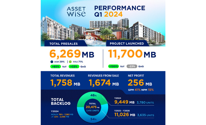 ‘ASW’ ประกาศผลงานไตรมาส 1/2567 มีรายได้รวม 1,758 ล้านบาท กวาดยอดขายโค้งแรก 6,269 ล้านบาท โตแรงกว่า 65% มั่นใจไตรมาส 2 ผลงานโดดเด่นสุด เดินหน้าโอนกรรมสิทธิ์ 6 โครงการใหม่ต่อเนื่อง