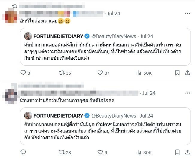 “คันปากมากเลยอ่ะ แต่รู้สึกว่ามันมีมูล ถ้ามีคนๆนึงบอกว่าจะไม่เปิดตัวแฟน เพราะบลาๆๆๆ แต่ความจริงแอบคบกับสามีคนอื่นอยู่ ที่เป็นข่าวดัง แล้วตอนนี้ไปเที่ยวด้วยกัน นักข่าวสายบันเทิงต้องรีบแล้ว”