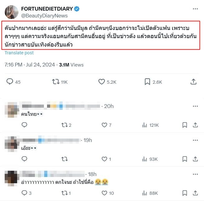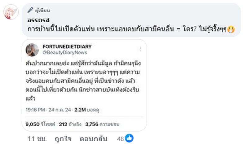 อ่านข่าวต้นฉบับได้ที่ : แฉใครไม่เปิดตัวแฟน เพราะแอบคบสามีคนอื่น ที่เป็นข่าวดัง แห่เมนต์สนั่นถ้าใช่ก็อึ้ง