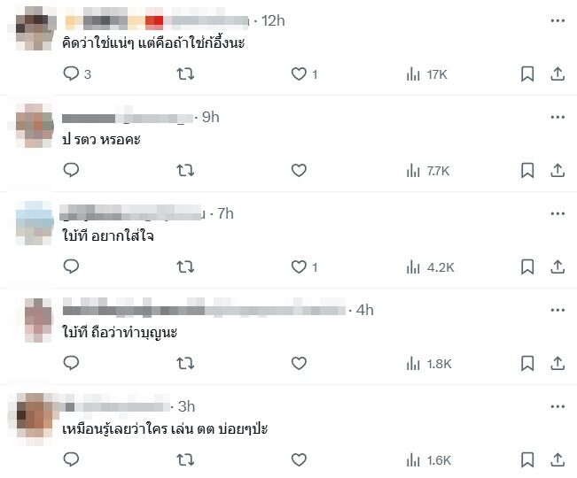 โดยหลายคนก็คอมเมนต์อยากรู้ บ้างก็บอกว่า นึกออกอยู่คนหนึ่ง , ชั้นนึกออกอยู่ 1 กรี๊ดดด , อันนี้ไม่ต้องเดาเลย , คิดว่าใช่แน่ๆ แต่คือถ้าใช่ก็อึ้งนะ , ป รตว หรอคะ , เหมือนรู้เลยว่าใคร เล่น ตต บ่อยๆป่ะ, พ พปพ ป่าว เป็นต้น