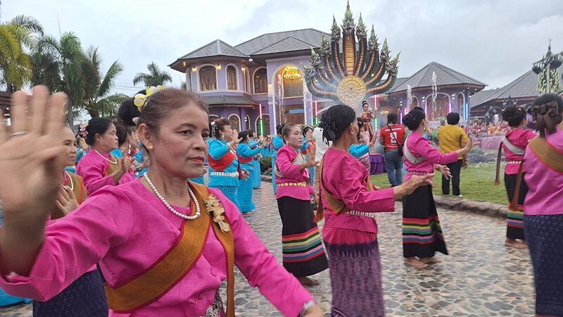 ซึ่งก่อนจะมีพิธีร่ายรำ คุณแหวน อ้นมา ภรรยาเจ้าของบ้านวังพญานาค ได้ส่งเสียงกรี๊ดร้องลั่น คล้ายพ่อปู่พญานาคมาประทับทรงโดยมีหน้าแดงกล่ำ โดยนางรำ 459 ชีวิตได้ร่วมรำถวายพญานาค 9 เศียร 3 เพลงคือ ไลน์เพลงบ้านวังพญานาค เพลงสณีโคตรบูรณ์ และเพลงออนซอนนครพนม ท่ามกลางความอ่อนช้อยและงดงาม
