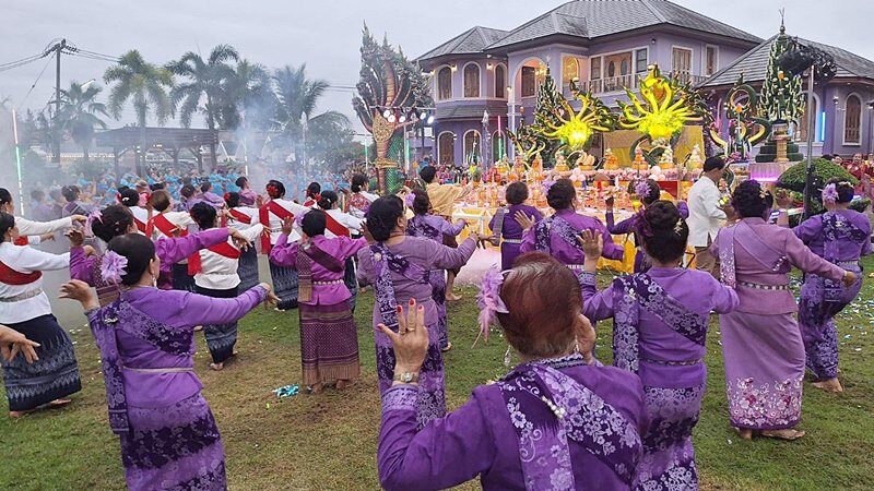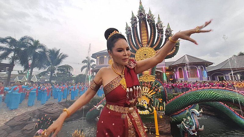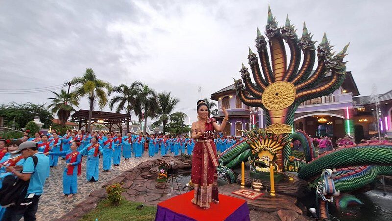 โดยเจ้าภาพได้จัดเครื่องเซ่นสรวงอลังการชุดใหญ่ ประกอบด้วยพานบายศรีบังลังก์พญานาค 9 เศียร 1 คู่ใหญ่ ขันหมากเบ็งสูง 2 เมตร ผลไม้ 9 ชนิด ไข่ต้ม 99 ฟอง น้ำมงคล 9 ชนิด พวงมาลัย และหีบสมบัติขนาดใหญ่ 1 คู่ โดยมีนายแนน ซี อดีตเอกอัครราชทูตกัมพูชาประจำบรูไน มาเป็นประธานในพิธีจุดธูปมงคลเซ่นไหว้พ่อปู่พญานาค 9 เศียร