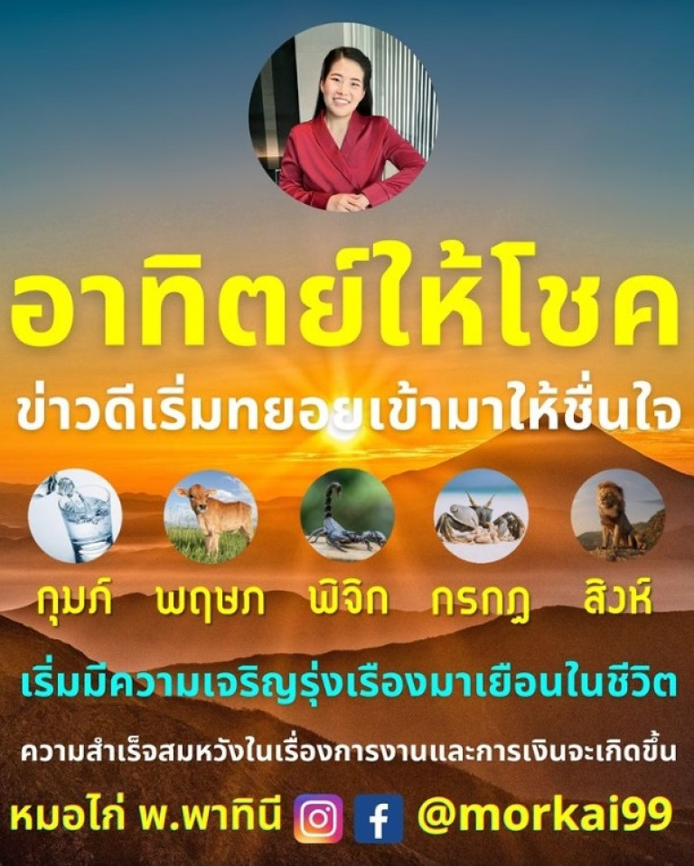 หมอไก่" นักพยากรณ์ชื่อดัง โพสต์ข้อความผ่านอินสตาแกรม @morkai99 ระบุว่า อาทิตย์ให้โชค ข่าวดีเริ่มทยอยเข้ามาให้ชื่นใจ เริ่มมีความเจริญรุ่งเรืองเข้ามาในชีวิต ความสำเร็จสมหวังในเรื่องการงานและการเงินจะเกิดขึ้น ได้แก่ กุมภ์ พฤษภ พิจิก กรกฎ สิงห์