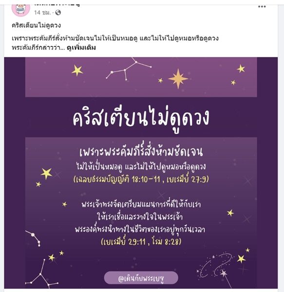 “คริสเตียนไม่ดูดวง เพราะพระคัมภีร์สั่งห้ามชัดเจนไม่ให้เป็นหมอดู และไม่ให้ไปดูหมอหรือดูดวง