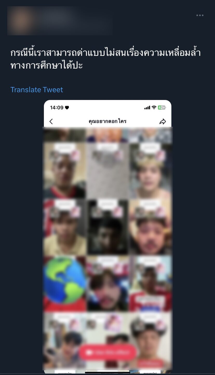 โดยมีผู้ใช้บัญชีทวิตเตอร์รายหนึ่ง ได้โพสต์ภาพฟิลเตอร์ดังกล่าวจาก TIKTOK ซึ่งมีผู้เล่นจำนวนมาก พร้อมเขียนแคปชั่นว่า "กรณีนี้ เราสามารถด่าแบบไม่สนเรื่องความเหลื่อมล้ำทางการศึกษาได้ปะ"