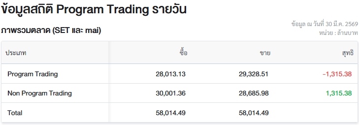 อัพเดต 30 มี.ค. เวลา 13.24 น. • เผยแพร่ 30 มี.ค. เวลา 13.23 น. • ข่าวหุ้นธุรกิจออนไลน์ผู้สื่อข่าวรายงานว่า วันนี้ (30 มี.ค.69) ตลาดหลักทรัพย์แห่งประเทศไทย (ตลท.) เปิดเผยข้อมูลซื้อขายรายวันผ่าน Program Trading หรือ “โปรแกรมโรบอทเทรดดิ้ง” พบว่ามีมูลค่าซื้อจำนวน 28,013.13 ล้านบาท และมูลค่าขายจำนวน 29,328.51 ล้านบาท เท่ากับขายสุทธิ 1,315.38 ล้านบาท