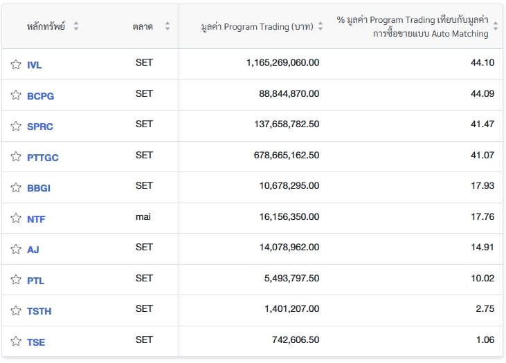 นอกจากนี้ ตลาดหลักทรัพย์แห่งประเทศไทย (ตลท.) รายงานข้อมูลหลักทรัพย์ที่มีการซื้อขายผ่านระบบ Program Trading สูงสุด โดยพิจารณาจากสัดส่วนมูลค่า Program Trading เทียบกับมูลค่าการซื้อขายแบบ Auto Matching พบว่ามี 10 หลักทรัพย์ที่มีการทำรายการสูงสุดในวันนี้ ได้แก่