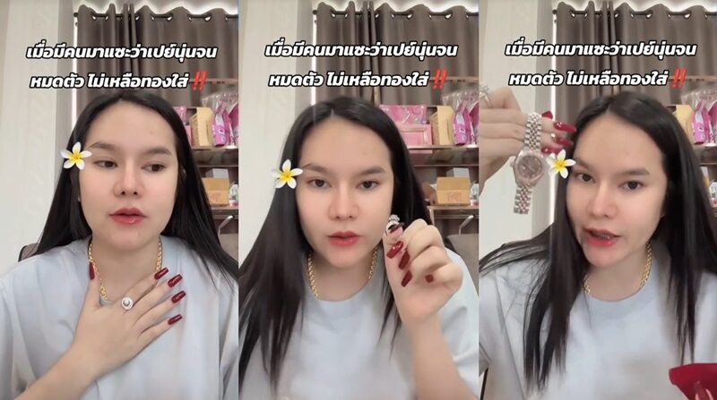 พร้อมทั้งหยิบทรัพย์สมบัติมากมายมาโชว์ให้ดู อาทิ แหวนแต่งล้านกว่าบาท นาฬิกาโรเล็กซ์ 6 แสน แหวนคาร์เทีย 2 แสน ถ้าของปลอมให้กระทืบ แหวนใส่เล่นๆ 2.7 หมื่น