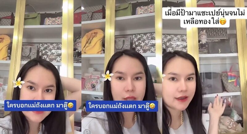 ทั้งยังโชว์ตู้กระเป๋าแบรนด์เนมสารพัดแบรนด์จำนวนไม่น้อยแต่ไม่ได้ใช้ อาทิ ชาแนล แอร์เมส ดิออร์ หลุยส์ วิตตอง กุชชี่ ปราดา ก็พอมี