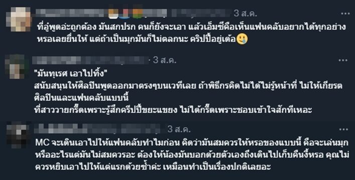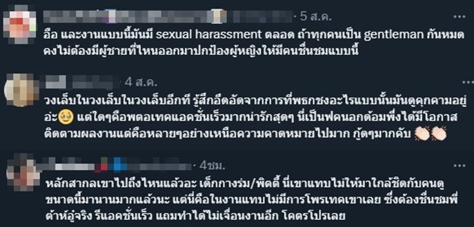 การกระทำนั้นได้รับเสียงชื่นชมทั้งภายในงานและในโซเชียล หลายคนมองว่าการเล่นมุกเชิง Sexual Harassment แบบนี้ควรหมดไปจากสังคมได้แล้ว