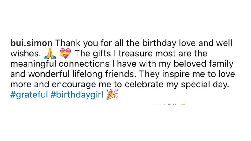 “Thank you for all the birthday love and well wishes. The gifts I treasure most are the meaningful connections I have with my beloved family and wonderful lifelong friends. They inspire me to love more and encourage me to celebrate my special day. #grateful #birthdaygirl”