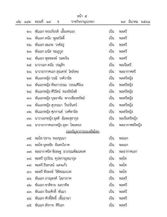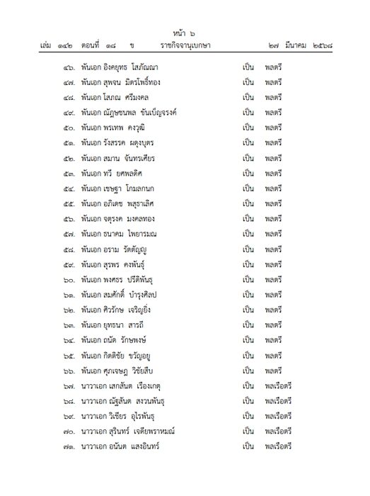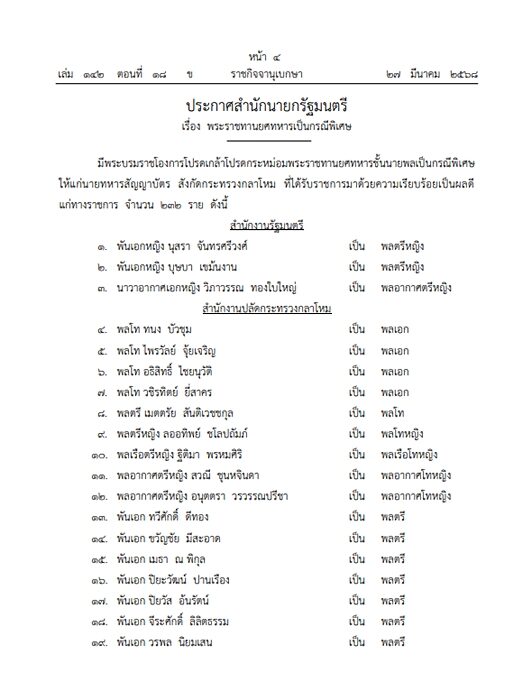 โดยระบุ มีพระบรมราชโองการโปรดเกล้าฯ พระราชทานยศทหารชั้นนายพลเป็นกรณีพิเศษ ให้แก่นายทหารชั้นสัญญาบัตร สังกัดกระทรวงกลาโหม ที่ได้รับราชการมาด้วยความเรียบร้อยเป็นผลดีแก่ทางราชการ จำนวน 232 ราย ดังนี้ เช่น