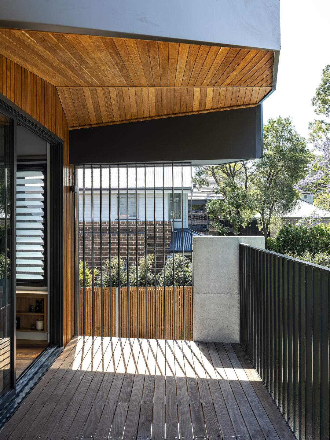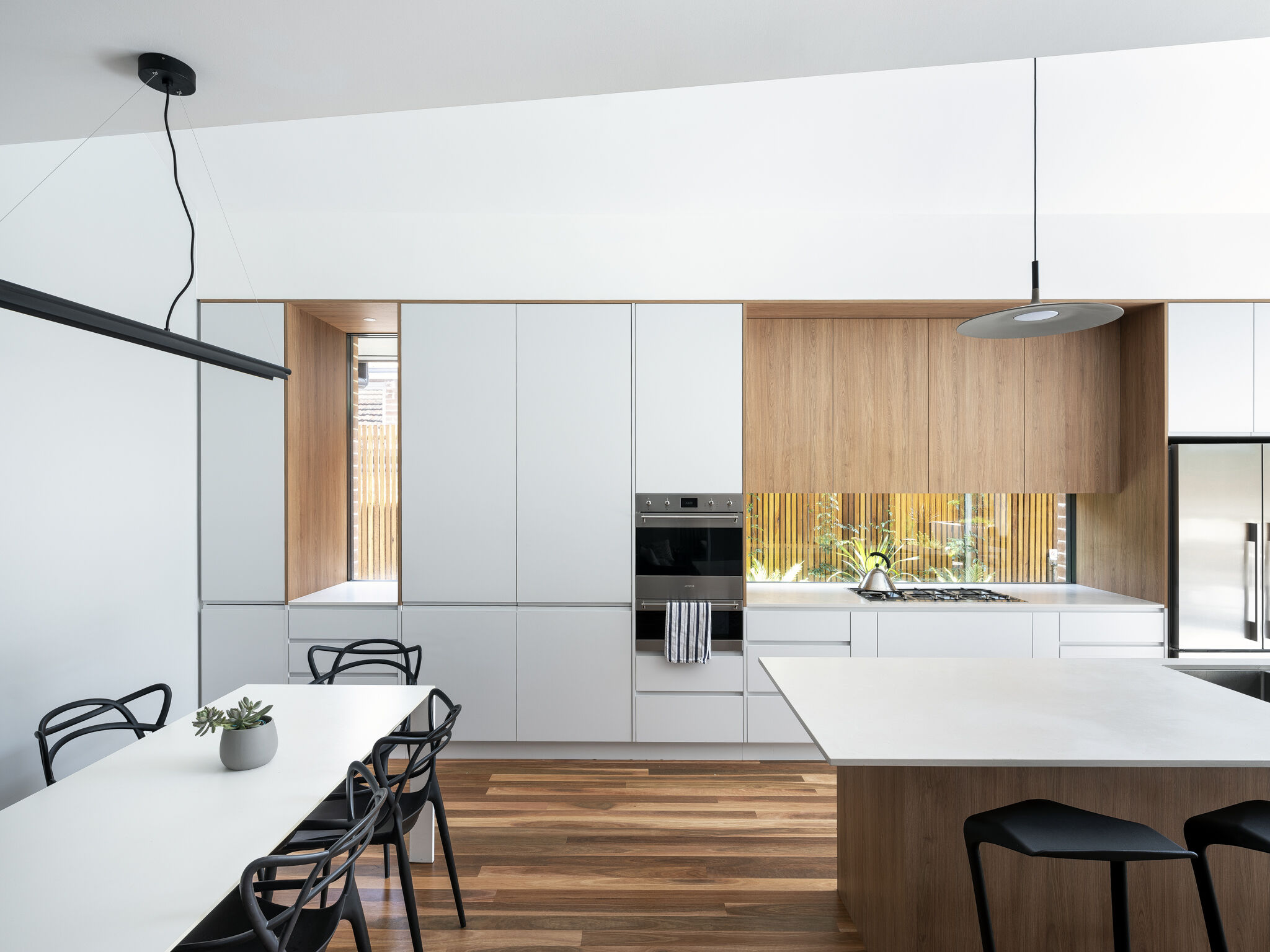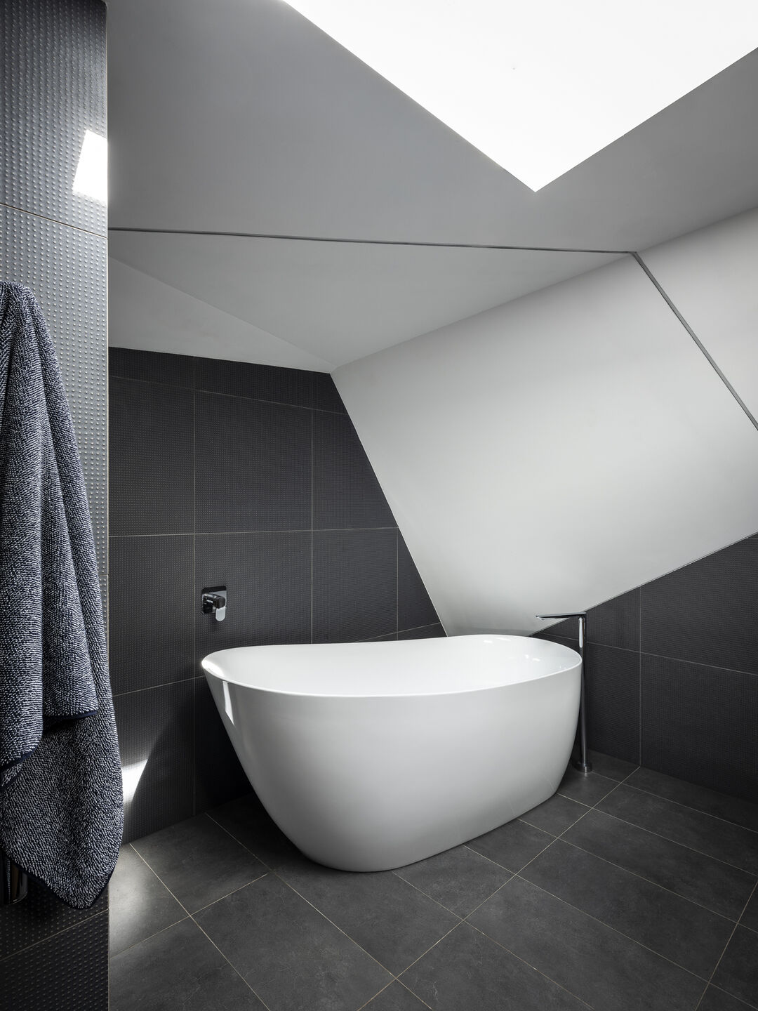 ภายในตกแต่งด้วยโทนสีขาวเป็นหลัก ผสมผสานด้วยพื้นไม้ ฟังก์ชันในบ้านมีการแบ่งขอบเขตอย่างเป็นสัดส่วน อีกทั้งยังมีครัวแบบไอส์แลนด์ สำหรับเป็นพื้นที่เตรียมอาหาร ซึ่งก็เป็นการแบ่งขอบเขตการใช้งานไปในตัว ส่วนวัสดุที่เลือกใช้มีความแตกต่างแต่เข้ากันได้อย่างลงตัว เช่น เหล็กกล้า เมทัลชีท คอนกรีต และไม้ นอกจากนี้ดีไซน์บ้านยังโดดเด่นด้วยหลังคาเฉียงที่เหมือนถูกพับไปมา ผนัง และหลังคาเป็นเมทัลชีท ให้ความรู้สึกทั้งอบอุ่น ความแข็งแกร่ง และการซ่อนเร้นในคราวเดียวกัน