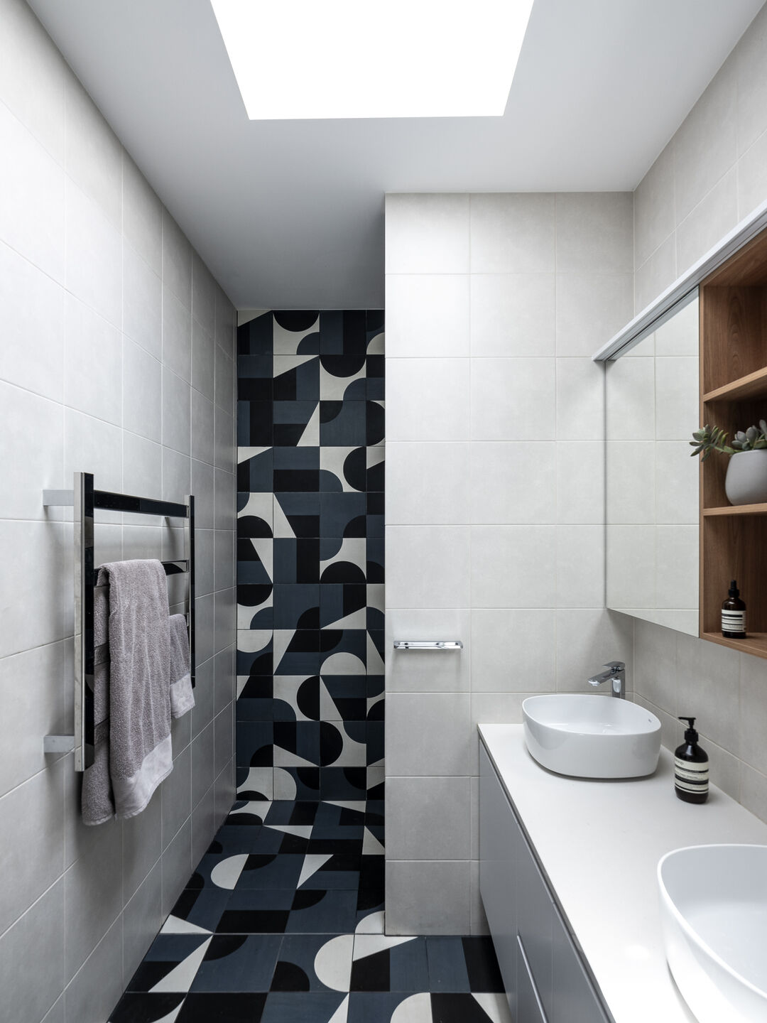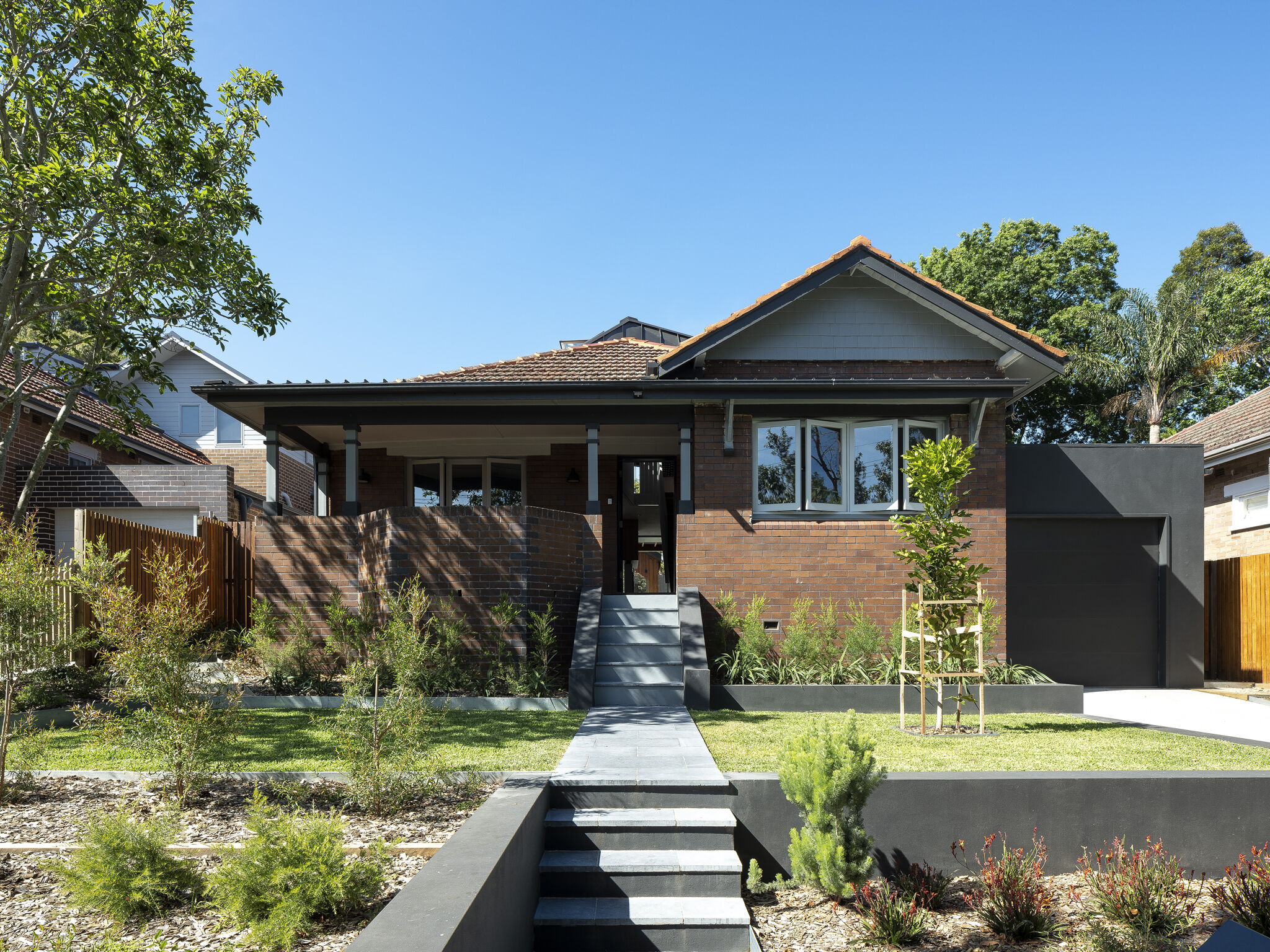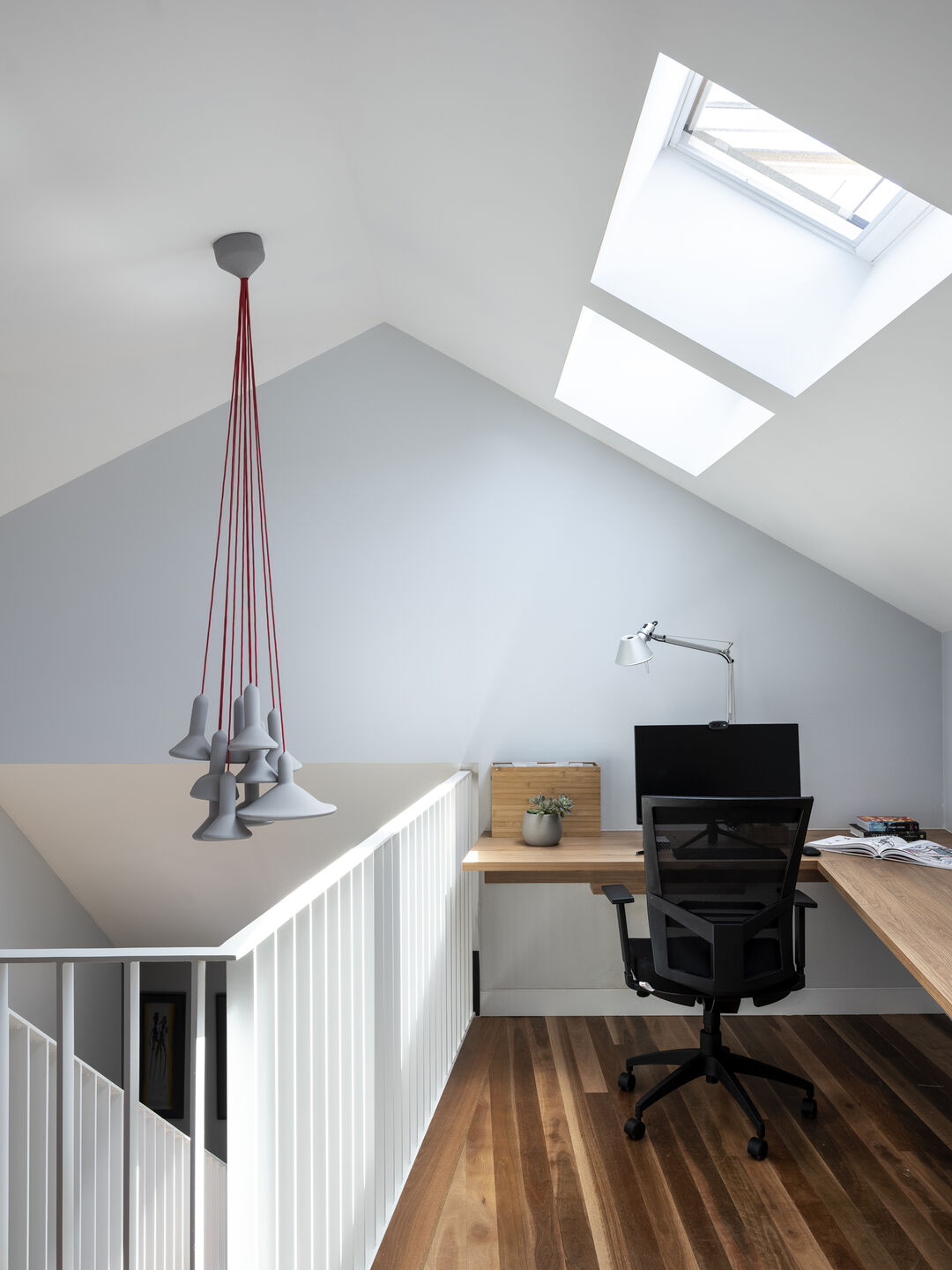 ภายในตกแต่งด้วยโทนสีขาวเป็นหลัก ผสมผสานด้วยพื้นไม้ ฟังก์ชันในบ้านมีการแบ่งขอบเขตอย่างเป็นสัดส่วน อีกทั้งยังมีครัวแบบไอส์แลนด์ สำหรับเป็นพื้นที่เตรียมอาหาร ซึ่งก็เป็นการแบ่งขอบเขตการใช้งานไปในตัว ส่วนวัสดุที่เลือกใช้มีความแตกต่างแต่เข้ากันได้อย่างลงตัว เช่น เหล็กกล้า เมทัลชีท คอนกรีต และไม้ นอกจากนี้ดีไซน์บ้านยังโดดเด่นด้วยหลังคาเฉียงที่เหมือนถูกพับไปมา ผนัง และหลังคาเป็นเมทัลชีท ให้ความรู้สึกทั้งอบอุ่น ความแข็งแกร่ง และการซ่อนเร้นในคราวเดียวกัน