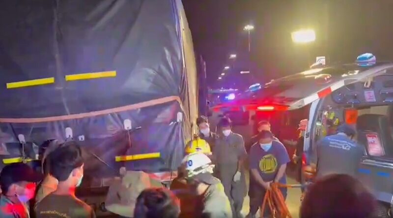 ที่เกิดเหตุพบรถบรรทุกพ่วง ยี่ห้อฮีโน่ ทะเบียนตัวหน้า 71-9615 พระนครศรีอยุธยา ทะเบียนลูกพ่วง 71-5410 สงขลา ด้านท้ายรถมุมขวาพบจักรยานยนต์ ยี่ห้อฮอนด้า เวฟ 100 ไม่ติดแผ่นป้ายทะเบียน พร้อมคนขับถูกอัดก๊อปปี้ติดคาอยู่ สภาพร่างคนขับรถจักรยานยนต์ยังอยู่ในท่านั่งติดกับเบาะแต่ร่างกายและลำคอหัก ซึ่งเจ้าหน้าที่ต้องนำเครื่องตัดถ่างมาช่วยกันงัดร่างผู้เสียชีวิตออกมา ทราบชื่อคือ นายณฐภัทร (ขอสงวนนามสกุล) อายุ 22 ปี