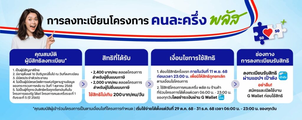 - ผู้ได้รับสิทธิเข้าแอปฯเป๋าตัง และกดแบนเนอร์โครงการคนละครึ่งพลัส เพื่อเริ่มใช้จ่าย วันที่ 29 ต.ค. – 31 ธ.ค. 68 เวลา 06:00 – 23:00 น.