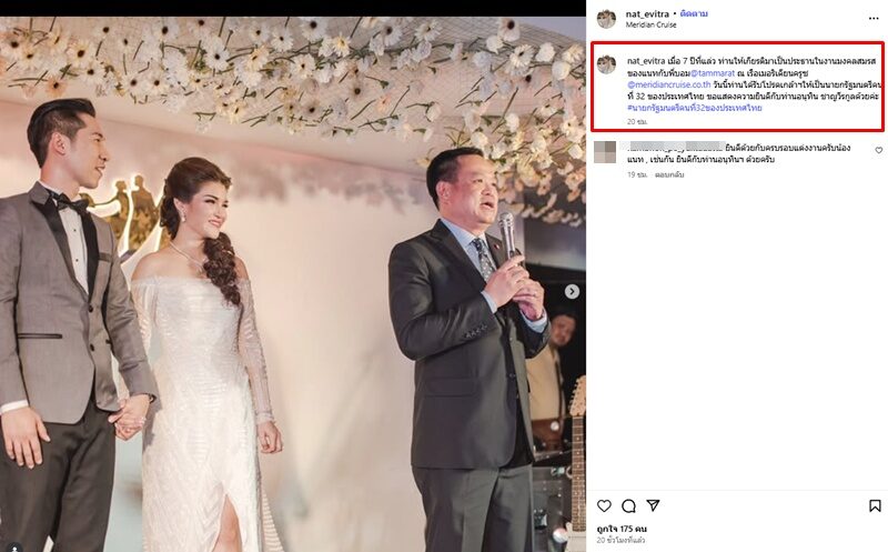 แนท ได้โพสต์ครบรอบแต่งงาน พร้อมทั้งร่วมยินดีกับ นายกฯ คนใหม่ด้วยว่า “เมื่อ 7 ปีที่แล่ว ท่านให้เกียรติมาเป็นประธานในงานมงคลสมรสของแนทกับพี่บอม@tammarat ณ เรือเมอริเดียนครูซ @meridiancruise.co.th”