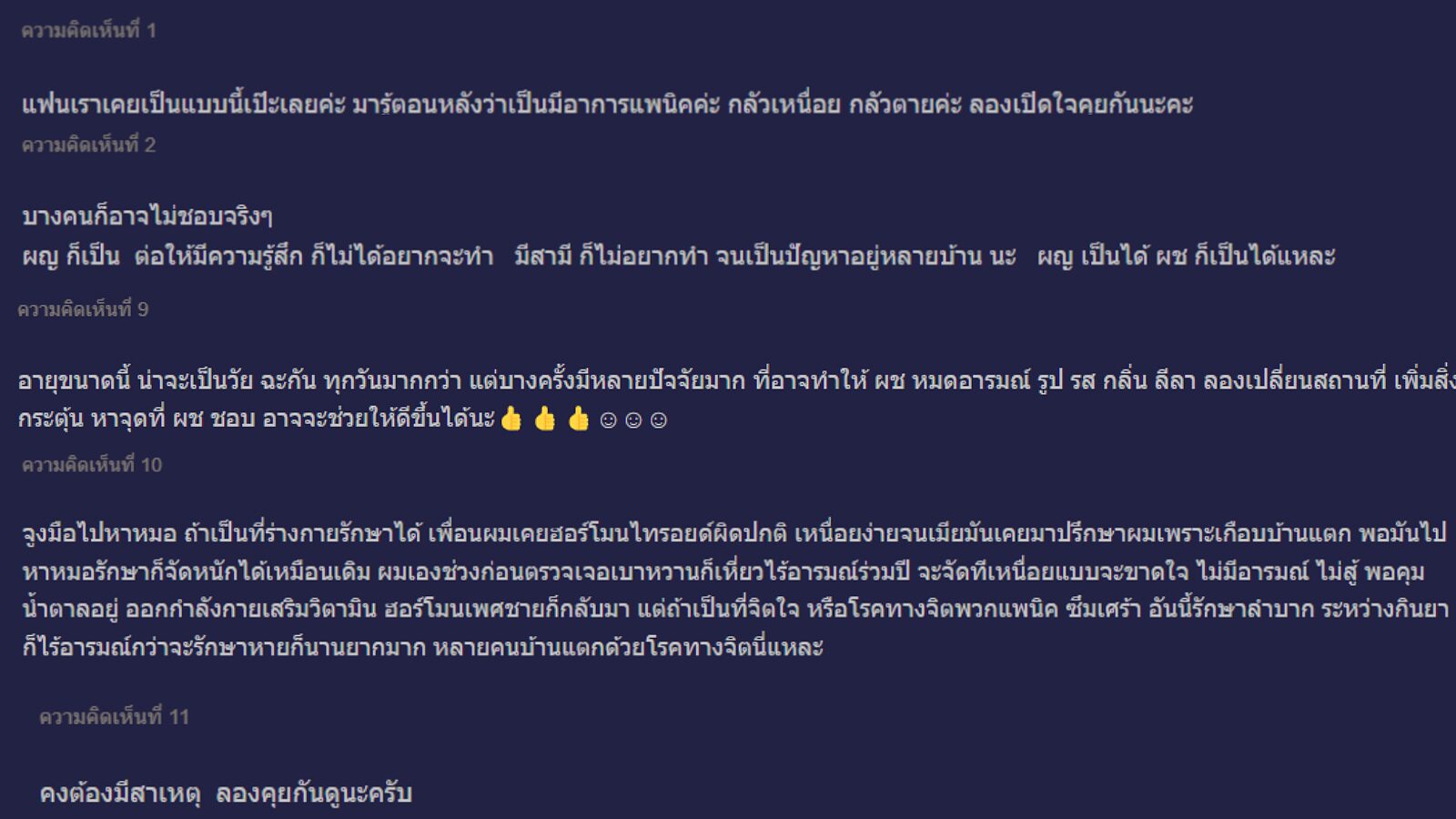 ด้านความคิดเห็นชาวเน็ตแนะนำว่า ความต้องการแต่ละคนไม่เหมือนกัน บางครั้งก็มีหลายปัจจัยที่อาจทำให้ผู้ชายหมดอารมณ์ ลองเปลี่ยนสถานที่ เพิ่มสิ่งกระตุ้นอาจจะช่วยให้ดีขึ้น หรือลองหาหมอ และลองปรึกษากันดูเพื่อที่ชีวิตคู่จะได้ยาวนานขึ้น