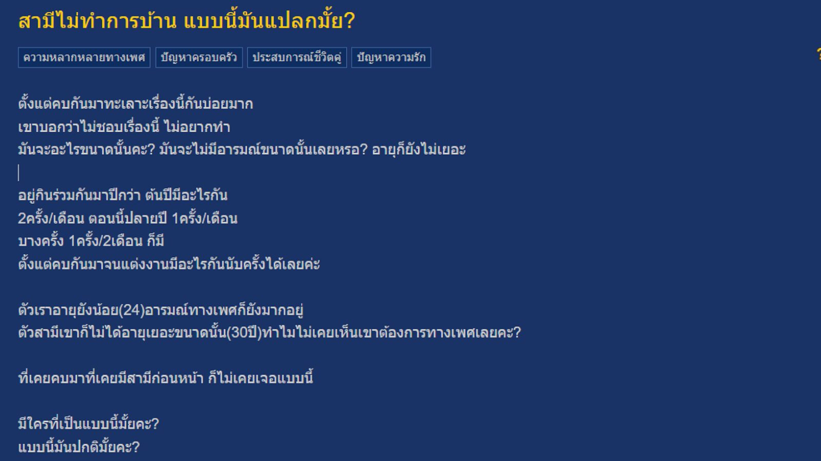เมื่อวันที่ 6 ก.ย. สมาชิกพันทิปรายหนึ่งได้ตั้งกระทู้ปรึกษาปัญหาชีวิตคู่ว่า ตลอดเวลาที่ผ่านมา เธอทะเลาะกับสามีบ่อยครั้งเพราะเขาไม่ยอมทำการบ้าน ซึ่งสามีมักจะให้เหตุผลว่า "ไม่ชอบเรื่องนี้", "ไม่อยากทำ"