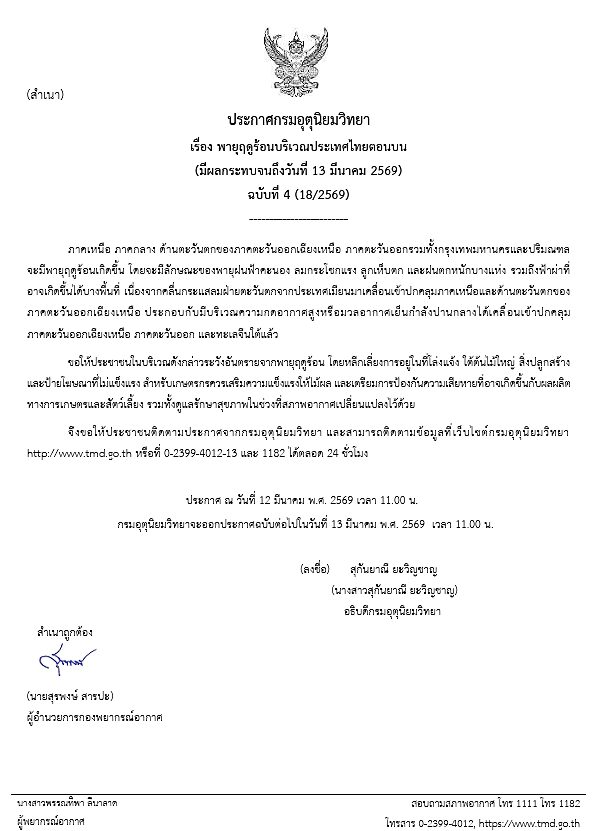 วันที่ 12 มี.ค.2569 กรมอุตุนิยมวิทยา ประกาศ เรื่อง พายุฤดูร้อนบริเวณประเทศไทยตอนบน (มีผลกระทบจนถึงวันที่ 13 มีนาคม 2569) ฉบับที่ 4 (18/2569) ระบุว่า ภาคเหนือ ภาคกลาง ด้านตะวันตกของภาคตะวันออกเฉียงเหนือ ภาคตะวันออกรวมทั้งกรุงเทพมหานครและปริมณฑล จะมีพายุฤดูร้อนเกิดขึ้น
