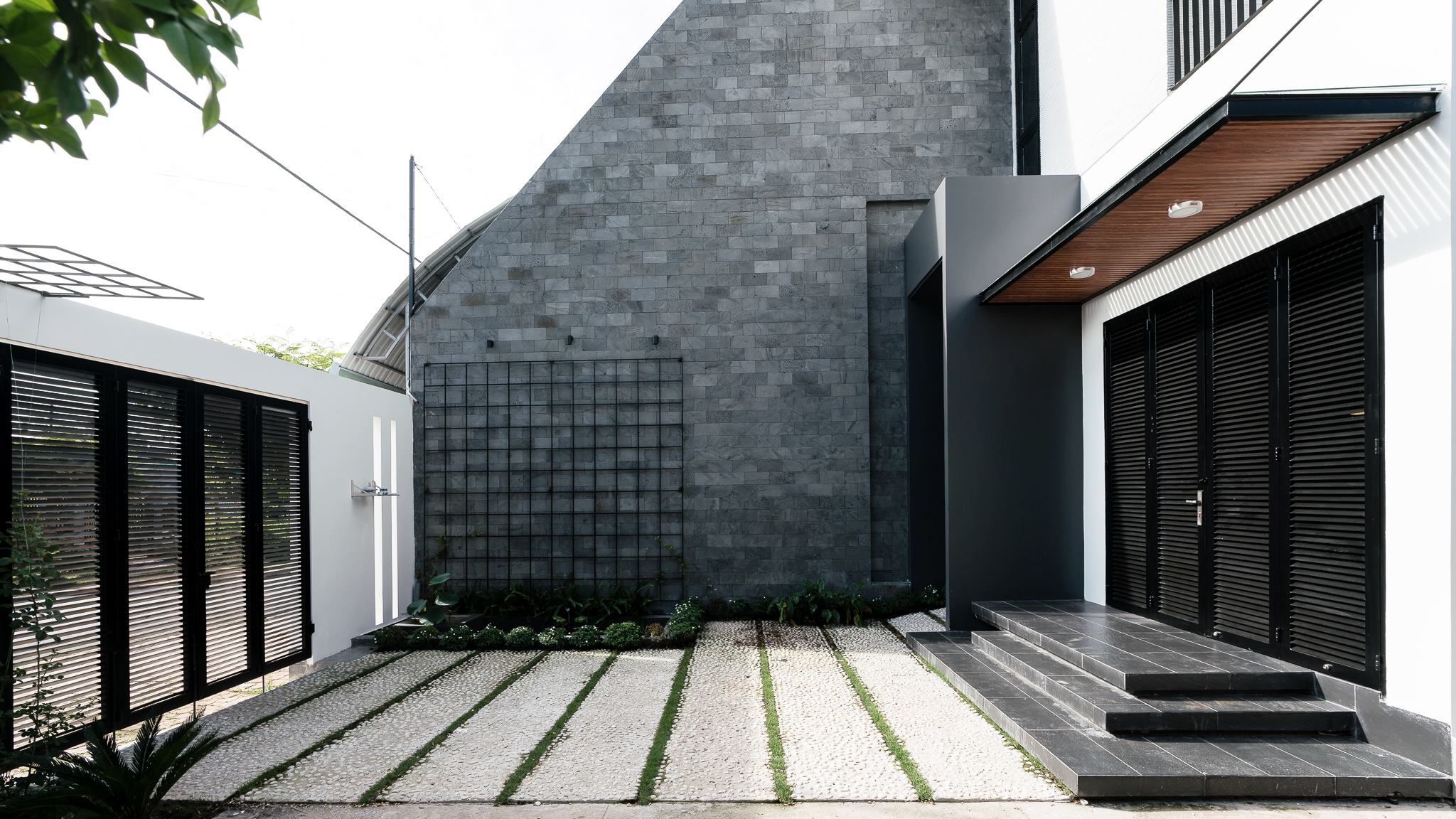 ทางเข้าบ้านโดดเด่นด้วยบานประตูสีดำขนาดใหญ่แบบบานเกล็ด และมีชายคาไม้ระแนงสีน้ำตาลอ่อนที่ให้แสงสว่างอบอุ่นในยามค่ำคืน เพื่อให้กลมกลืนกับบรรยากาศชานเมือง พื้นทางเดินจึงถูกออกแบบด้วยหินกรวดสลับแนวหญ้า สร้างความรู้สึกใกล้ชิดธรรมชาติ