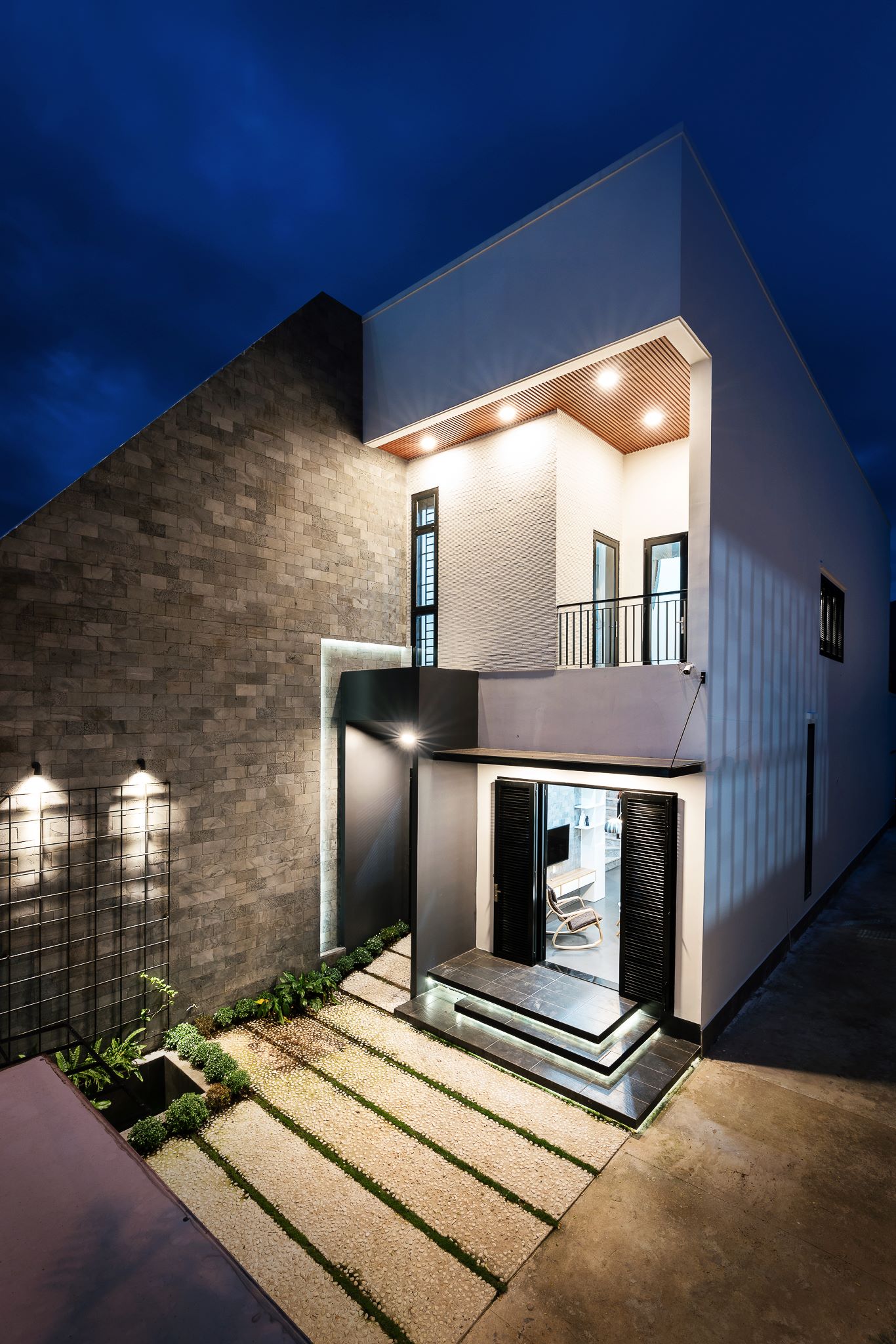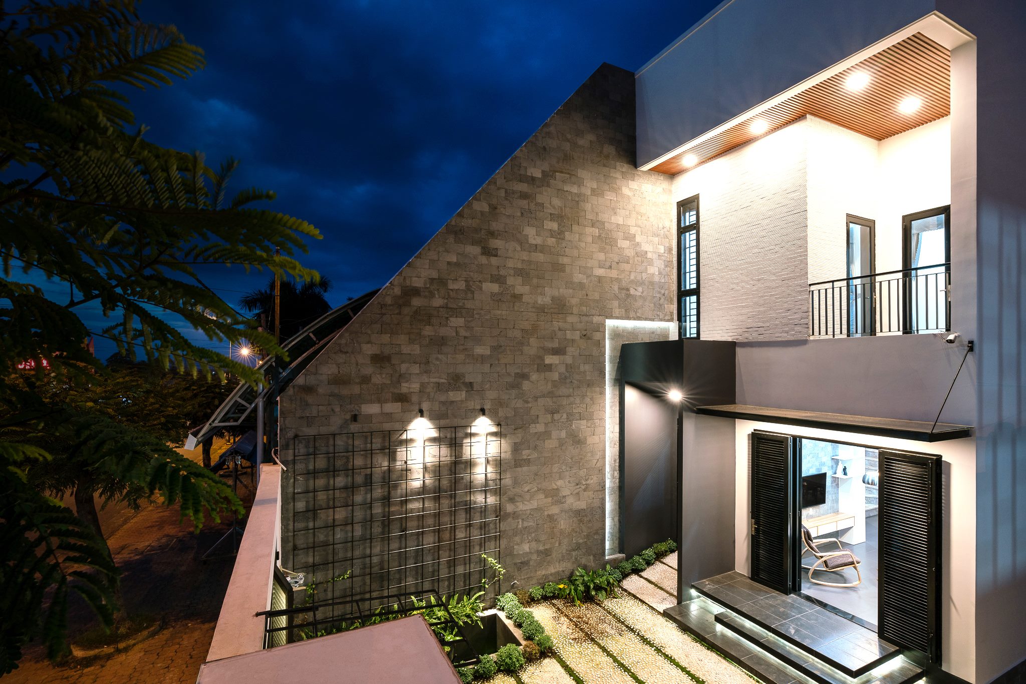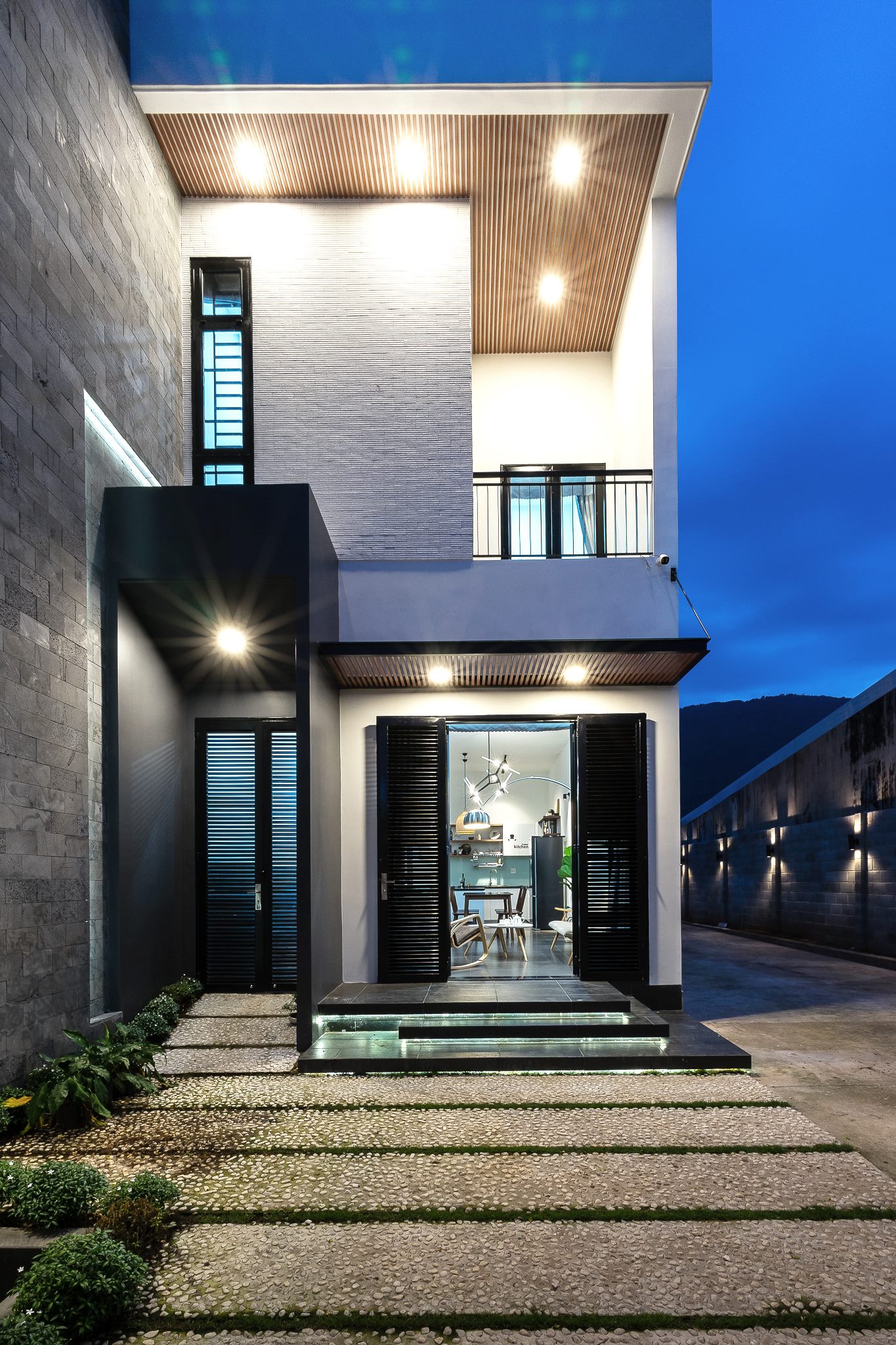 แสงไฟในยามค่ำคืนถูกออกแบบอย่างพิถีพิถัน ทั้งไฟดาวน์ไลท์บนฝ้าระแนง ไฟติดผนัง และไฟส่องสว่างบริเวณทางเข้า สร้างความอบอุ่นท่ามกลางความเงียบสงบของย่านชานเมือง