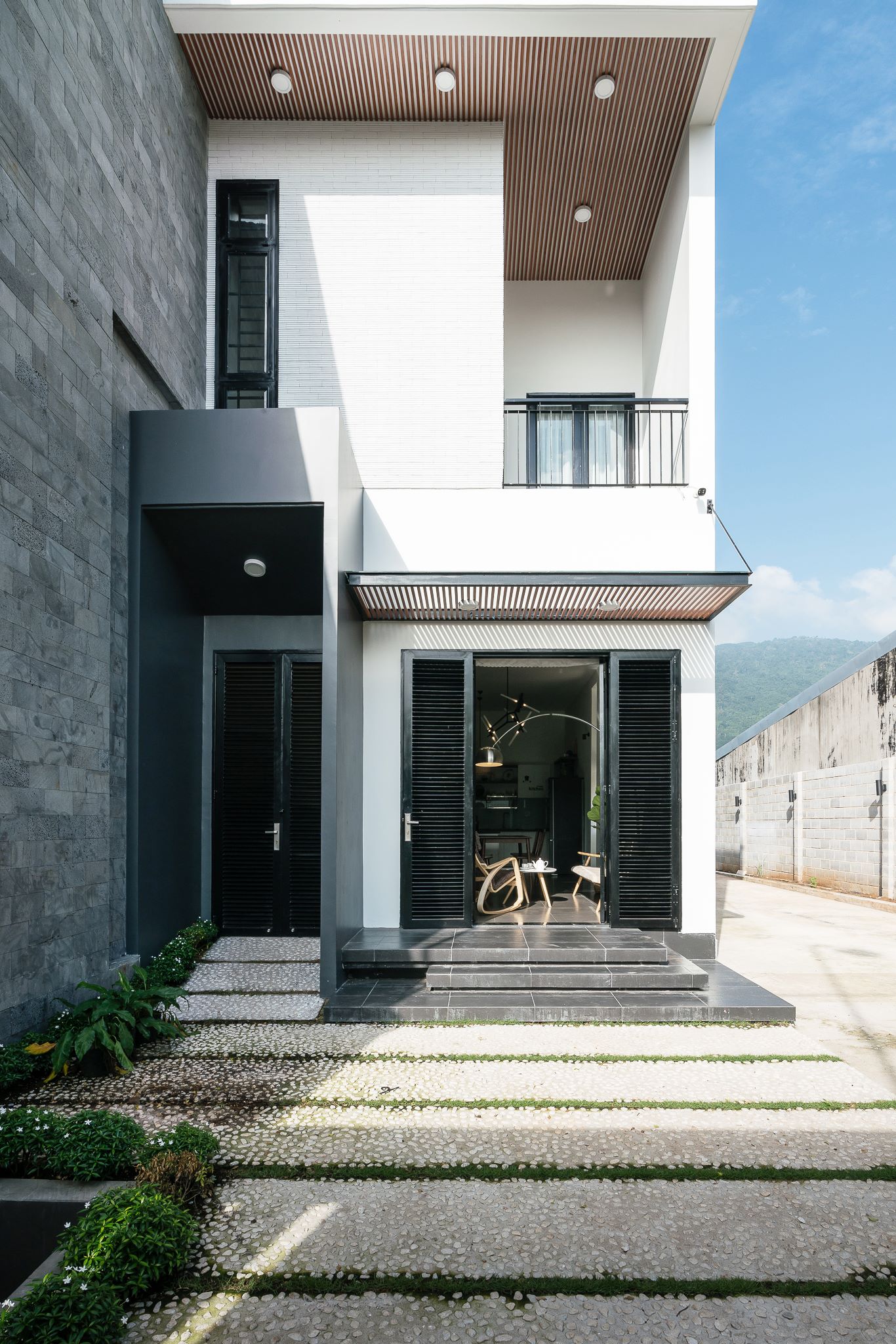 แม้จะตั้งอยู่ห่างจากความวุ่นวายของตัวเมือง แต่บ้านหลังนี้กลับไม่ได้ถูกจำกัดด้วยความเป็นชนบท ด้วยการผสมผสานอย่างลงตัวระหว่างความเรียบง่ายของโทนสีขาว-เทา กับความทันสมัยของวัสดุและรูปทรง ผนังด้านหนึ่งใช้หินสีเทาเรียงเป็นลวดลาย สร้างมิติและพื้นผิวที่น่าสนใจ ขณะที่อีกด้านเป็นผนังสีขาวสะอาดตา