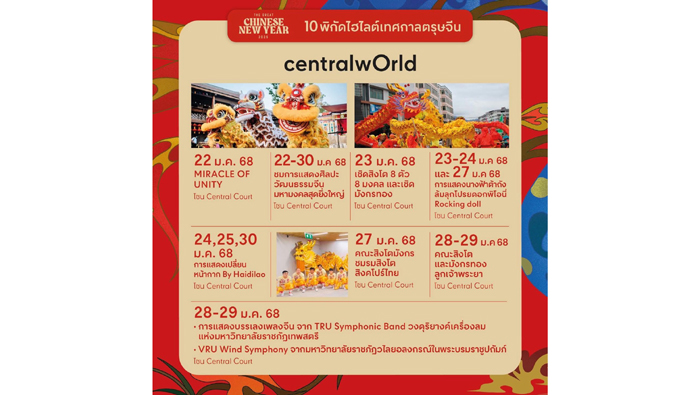 · อลังการ หนึ่งในแลนด์มาร์กสำคัญเทศกาลตรุษจีนประเทศไทย ผนึก ททท. ยกไชน่าทาวน์ไว้ใจกลางเมือง ยิ่งใหญ่เต็มพื้นที่หน้าเซ็นทรัลเวิลด์ กว่า 2,500 ตร.ม. ไฮไลต์ อาทิ โคมไฟเจ้าแม่กวนอิมสูง 7 เมตร, โคมไฟฮกลกซิ่วสูง 6 เมตร, การแสดงพิเศษจากสาธารณรัฐประชาชนจีน 3 มณฑล, คอนเสิร์ตศิลปิน T-Pop ชื่อดังกว่า 40 ชีวิต และกินเที่ยว 30 ร้านดัง เริ่ม 28 ม.ค. - 2 ก.พ. 68